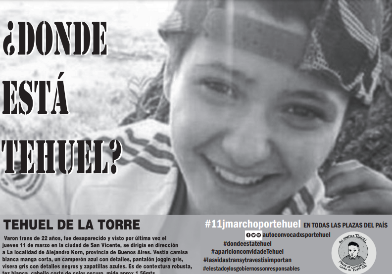 Tehuel fue desaparecido el 11 de marzo, cuando fue a la localidad de Alejandro Korn a una entrevista de trabajo. Luego de casi tres meses de investigación, rastrillajes, y movilizaciones, aún no se sabe su paradero. Oscar Alfredo Montes y Luís Alberto Ramos, fueron detenidos por “encubrimiento en concurso real con falso testimonio”. Una fotografía reveló que el 11 de marzo a las 20 horas, Tehuel se encontraba con los dos hombres en la casa de Ramos.