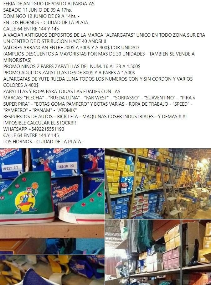 Desde jeans y muebles, hasta objetos coleccionables y zapatillas, la “Feria del antiguo depósito de Alpargatas” abrirá al público para rematar sus productos a precios accesibles. Será este sábado y domingo en Los Hornos y habrá productos usados y nuevos que quedaron guardados en aquel espacio de 64 entre 144 y 145.