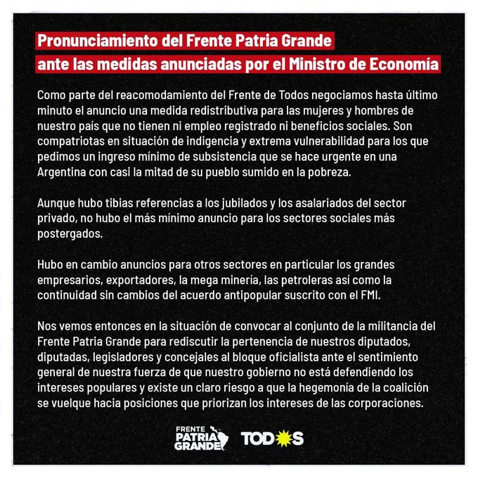 Tras las medidas económicas anunciadas por el flamante Ministro Sergio Massa, el Frente Patria Grande denunció que “no hubo una sola medida en favor de los sectores más postergados”. En este sentido, convocaron a “rediscutir la pertenencia” del espacio dentro del Frente de Todos.