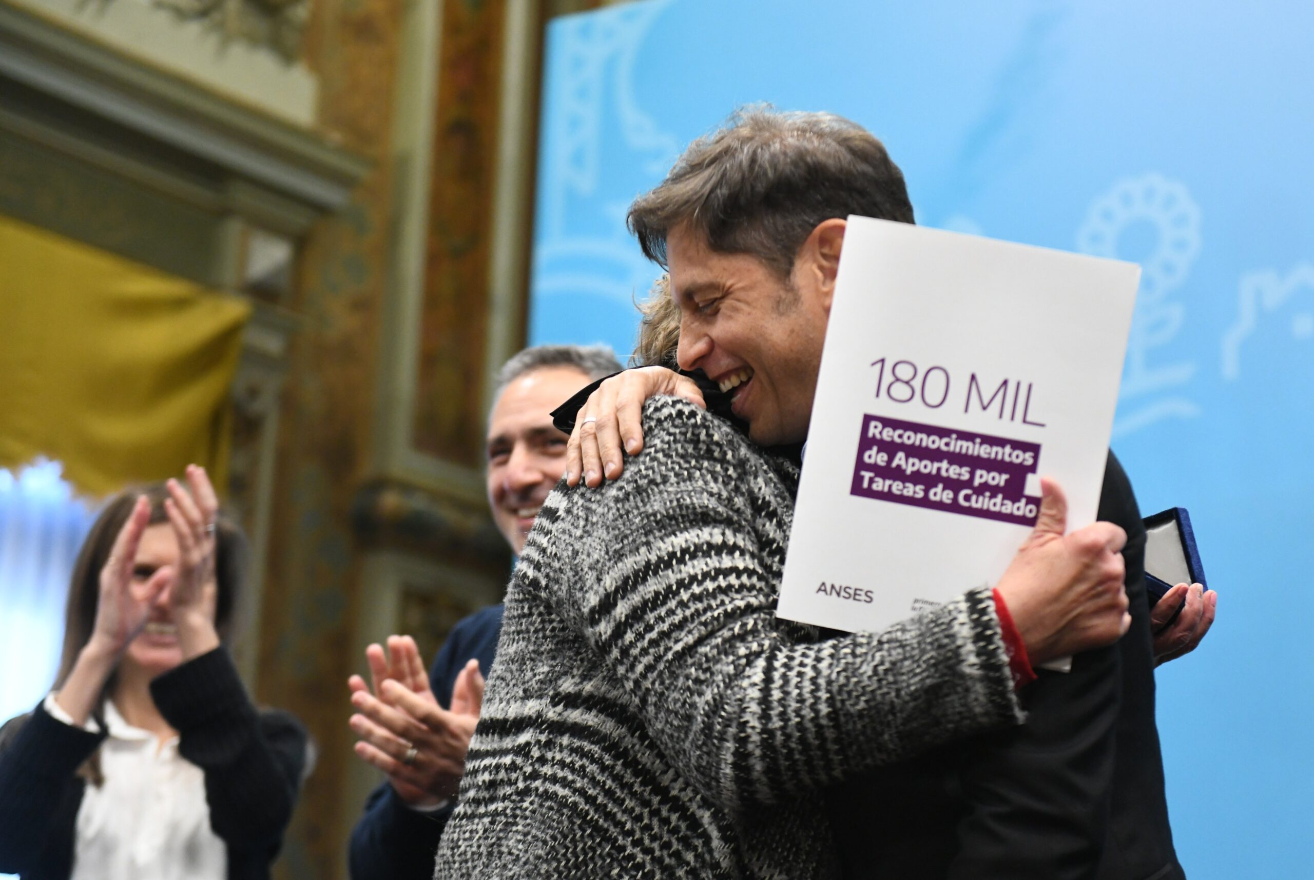 A un año de la implementación del Programa de Reconocimiento de Aportes por Tareas de Cuidado, Axel Kicillof encabezó un acto donde hizo entrega de la jubilación 180 mil. Lo acompañaron la titular de ANSES, Fernanda Raverta y el diputado nacional Máximo Kirchner.