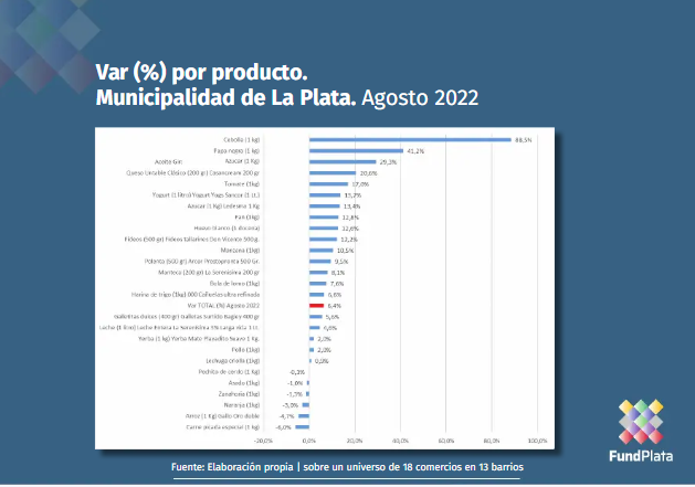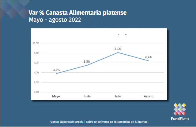 La Fundación FundPlata elaboró el informe mensual sobre la variación de la canasta alimentaria en la ciudad de La Plata –integrada por productos de carnicería, almacén y verdulería- que arrojó un 6,4% el mes de agosto quedando por debajo del mes de julio, cuando se había registrado un 8,1%.