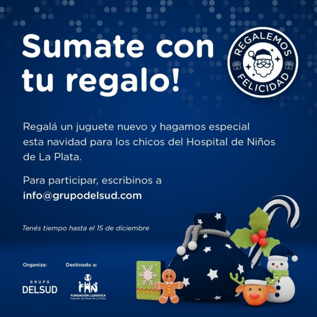 El Grupo Delsud junto a la Fundación Ludovica del Hospital de Niños de La Plata, han lanzado la campaña “Regalemos Felicidad“. El fin de esta campaña es recolectar juguetes para regalar en esta navidad a los niños internados en dicho nosocomio. Para esta iniciativa, invitan a comercios, organizaciones y empresas a regalar un juguete nuevo.